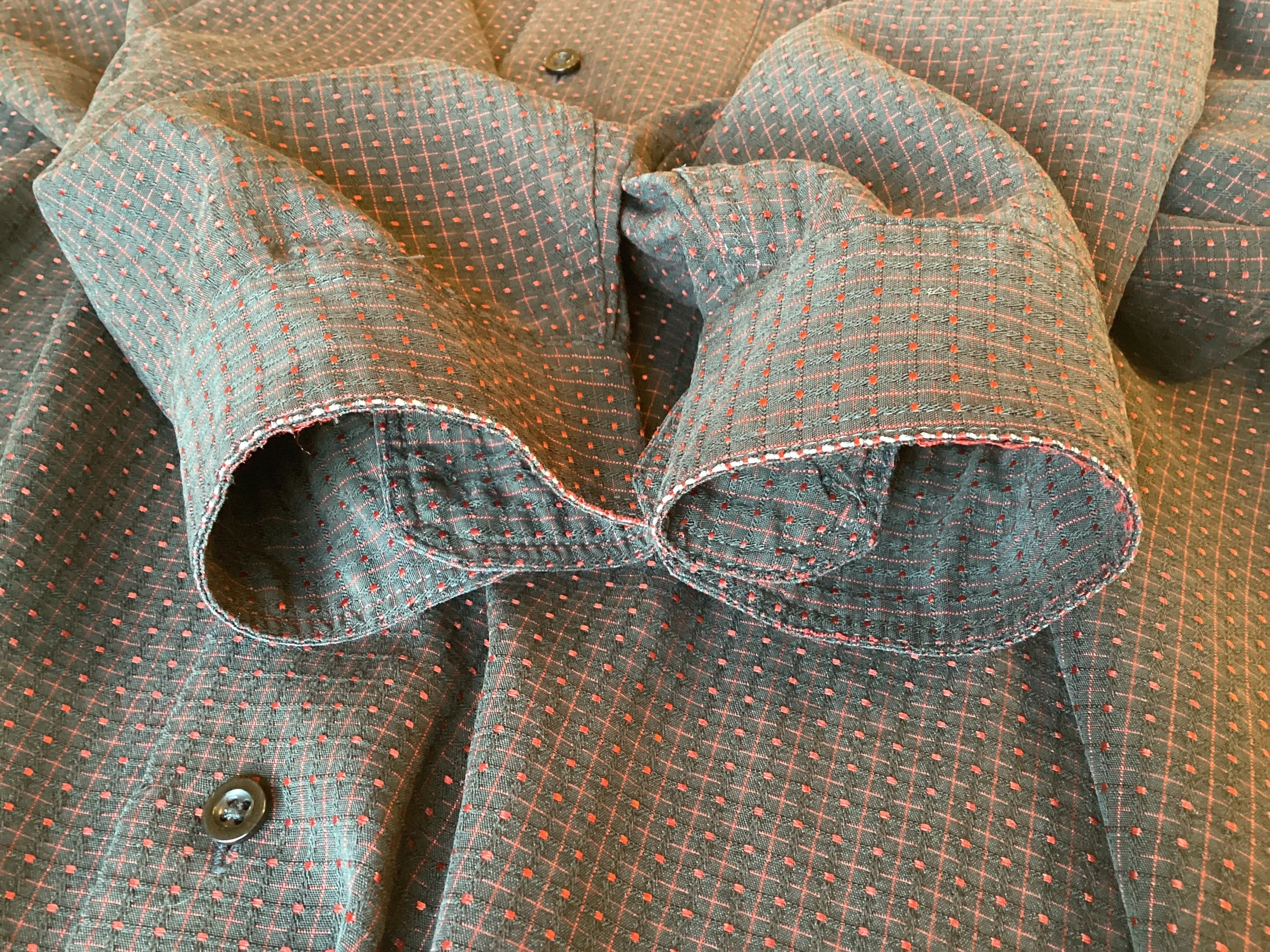 赤のドットがポイントのレーヨンシャツです。
