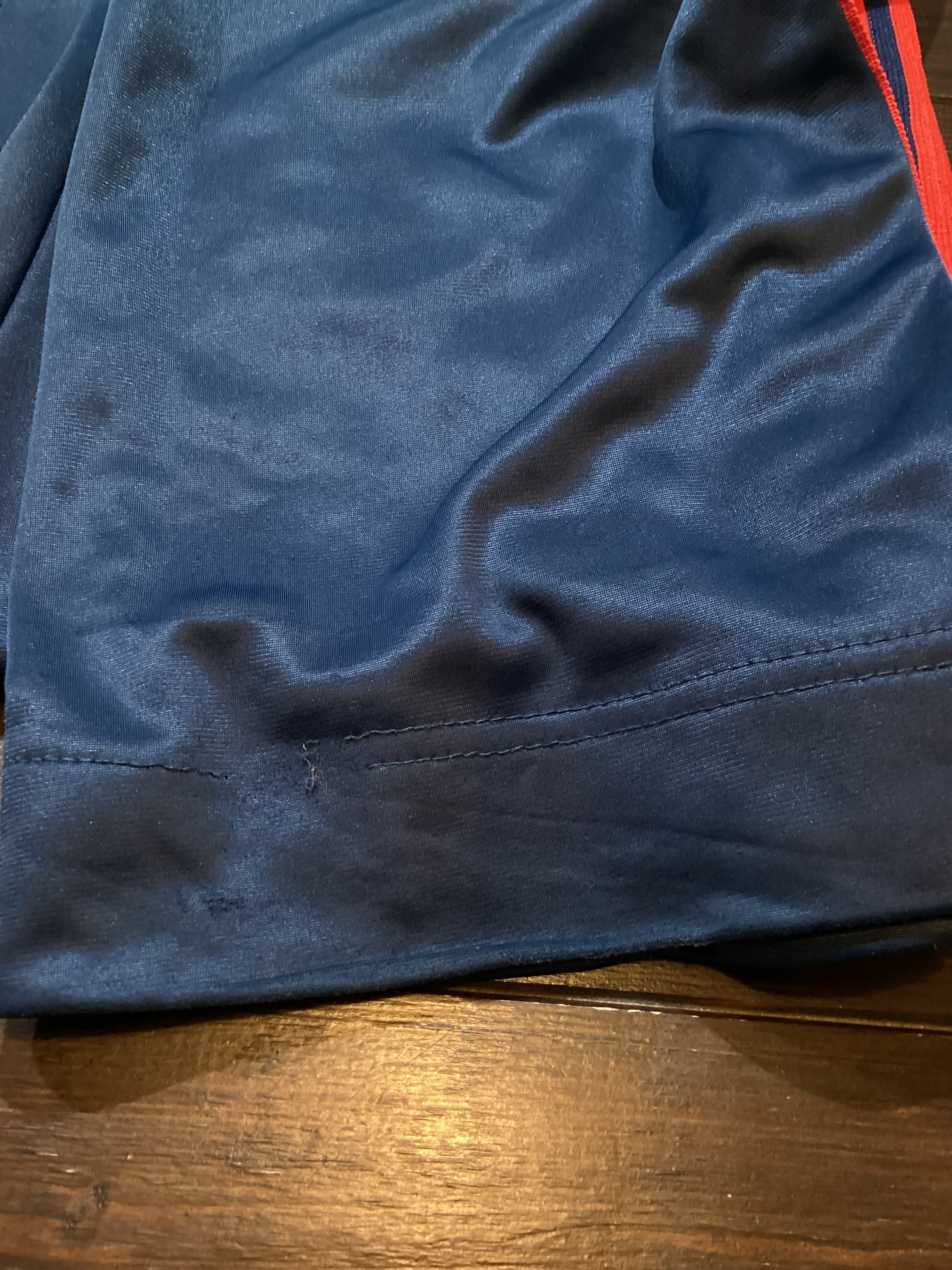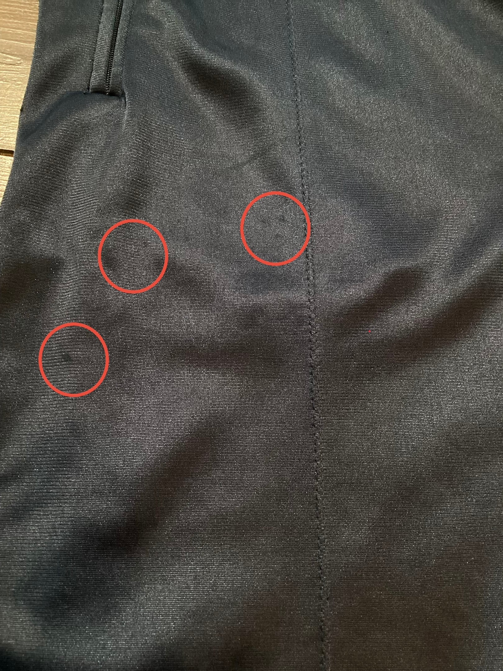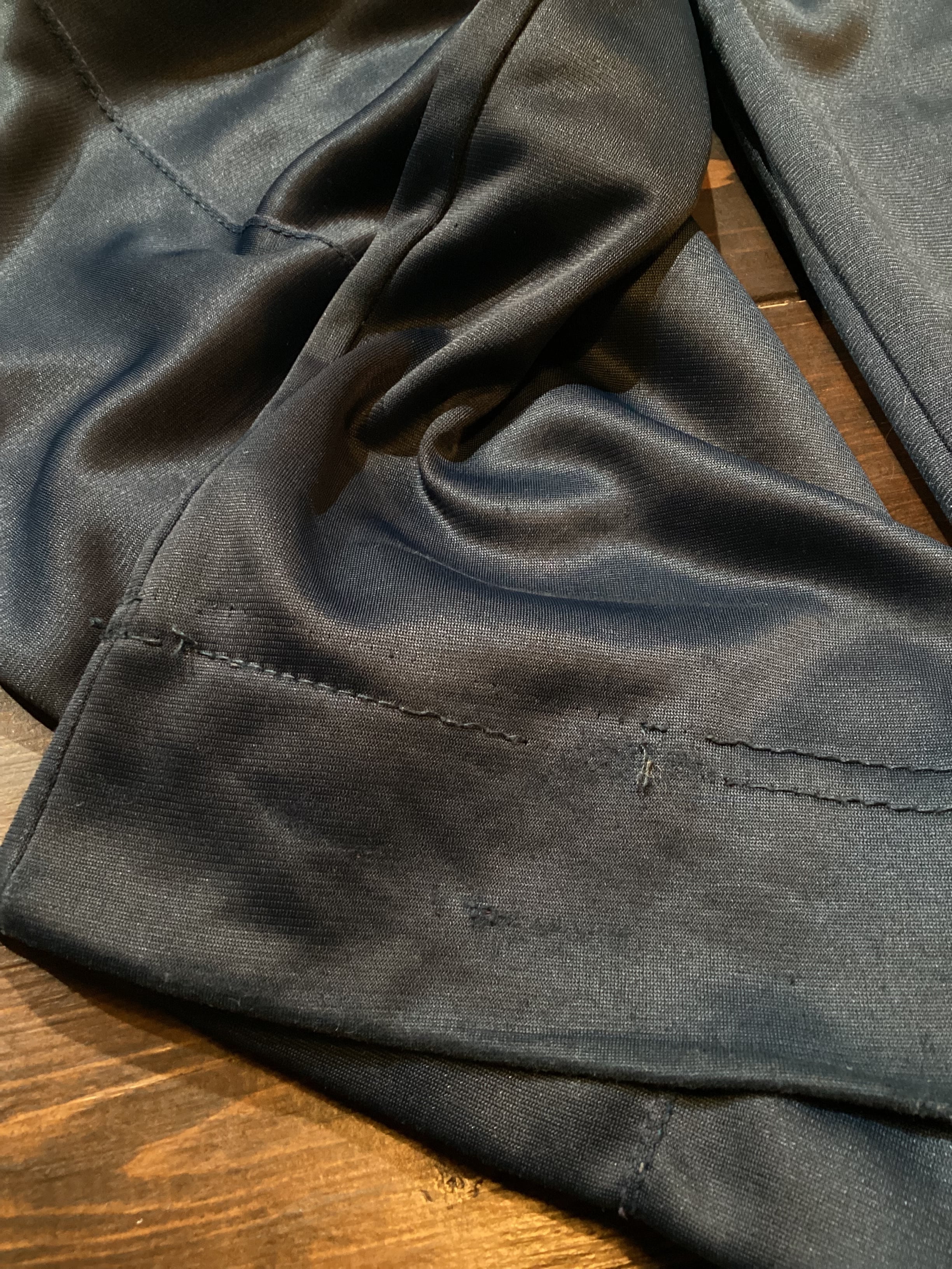 フロント右足に数カ所擦れとシミがございます。背面腰下部分にリペア痕、両裾に擦れがございます。