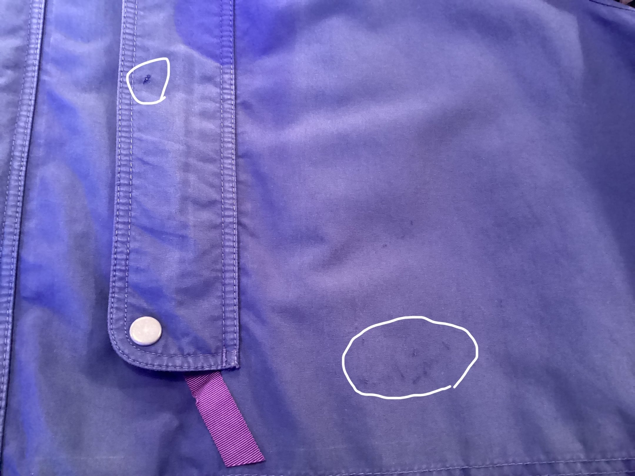 右腕とフロント部分にダメージと、バック下部に薄シミがございます。